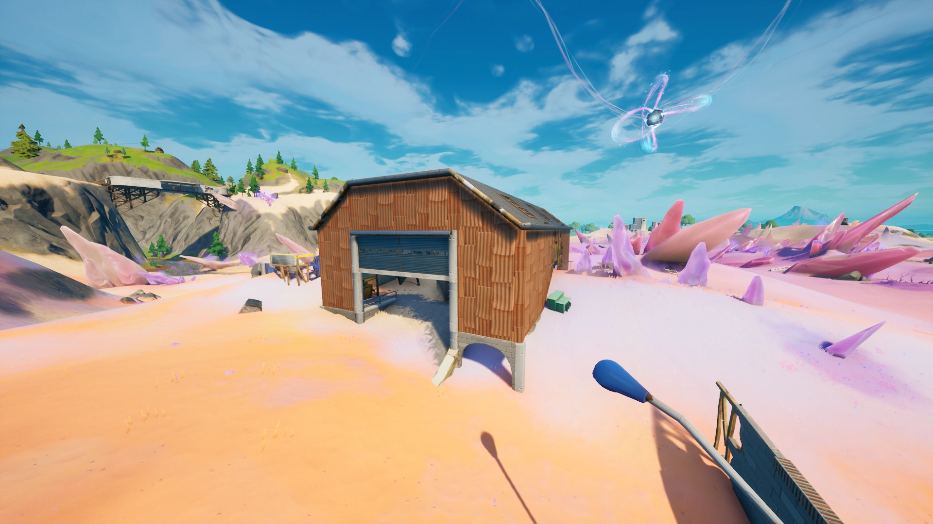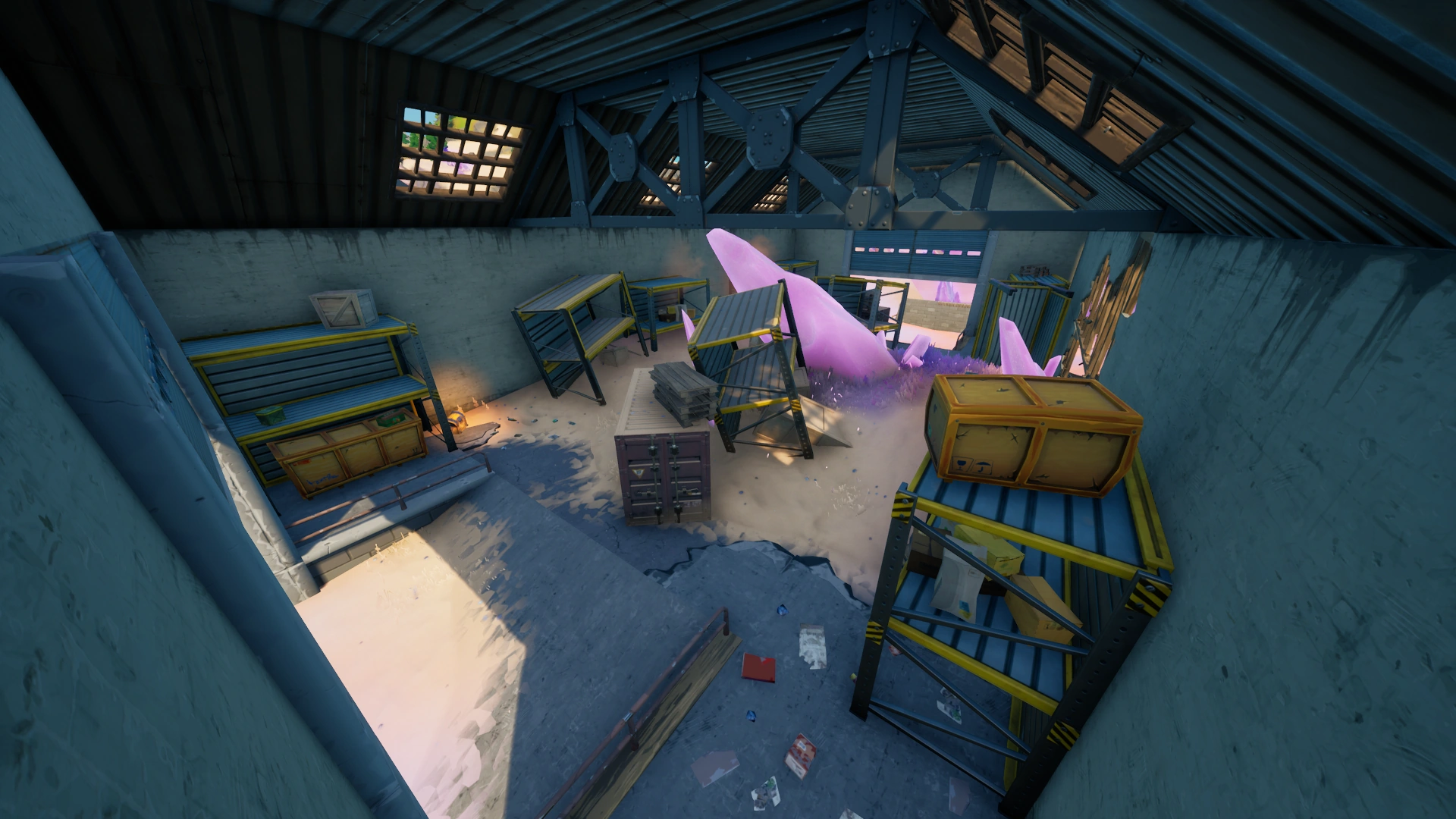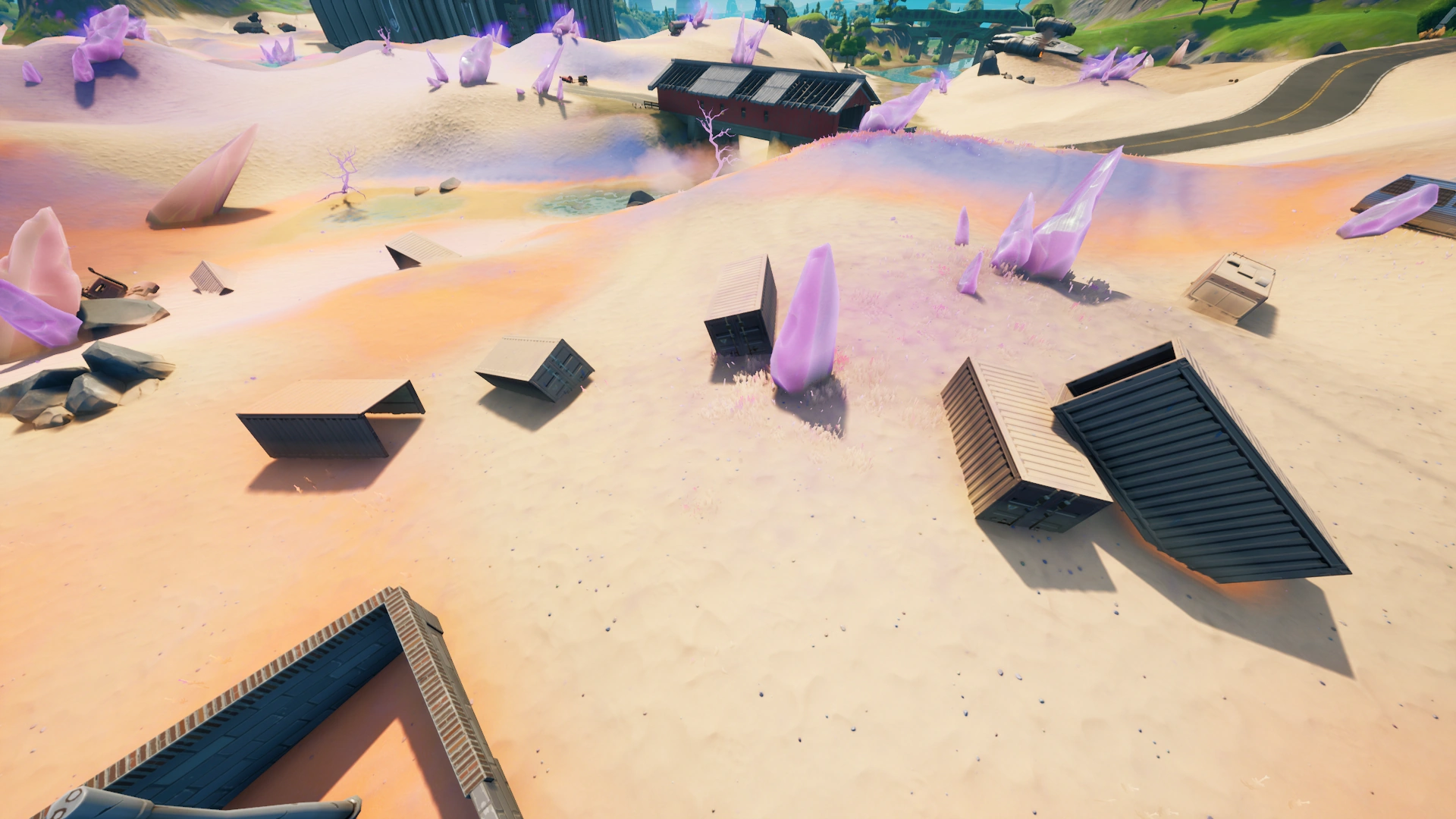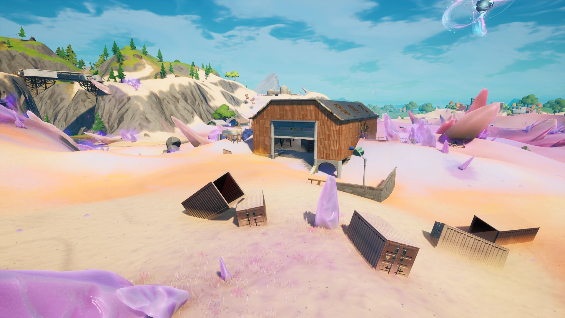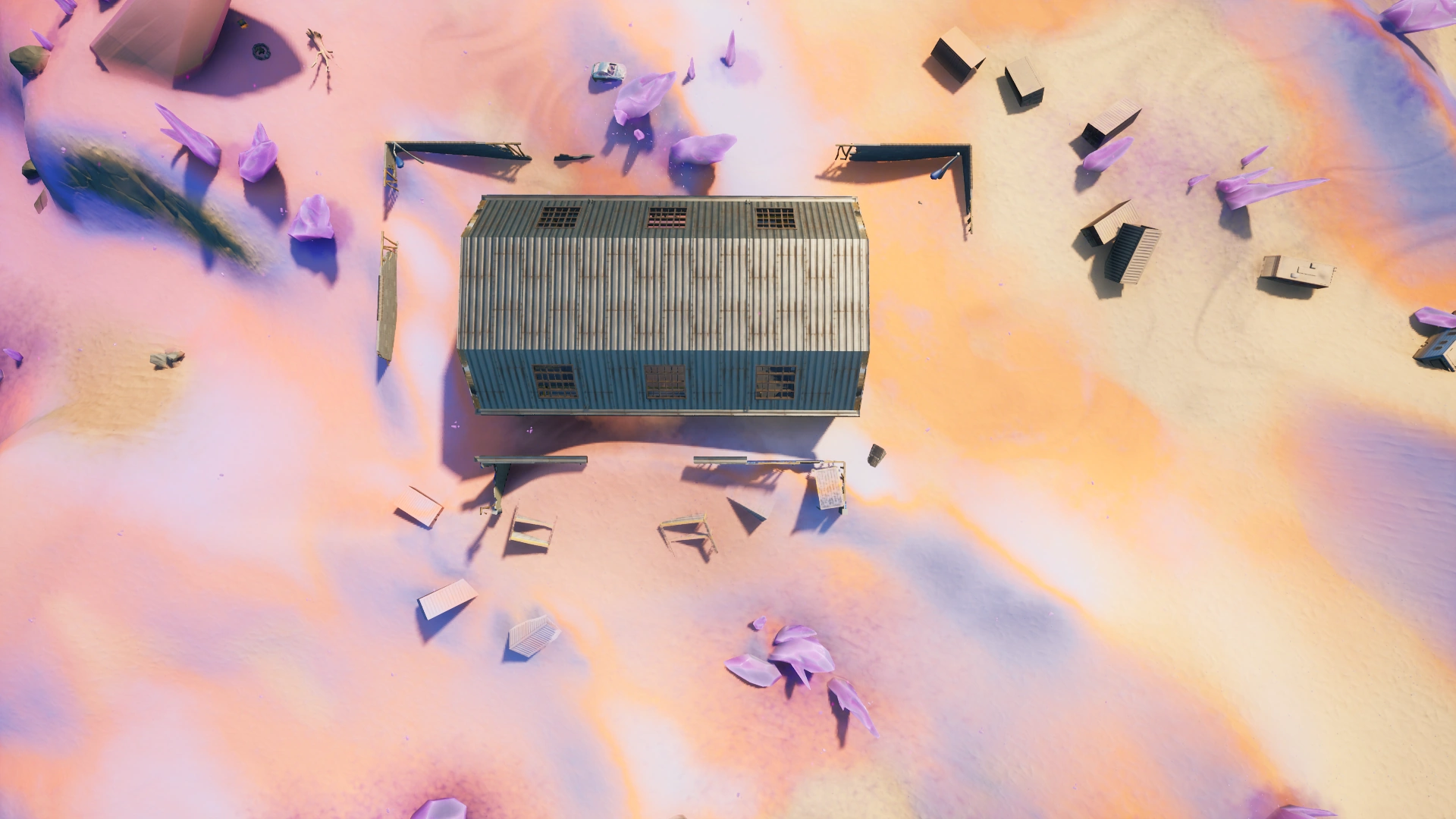 Dusted Depot is a Landmark in Battle Royale added to the map in Chapter 2 Season 5, located inside the coordinate E4, east of The Spire, southwest of Colossal Crops, northwest of Gas N' Grub, north of Drop Shop, far south of Scenic Spot, and southeast of Risky Reels. It features the red warehouse from Dusty Depot, although it has been greatly damaged by the sand. There is also a little bit of the blue warehouse, although that is even more damaged.