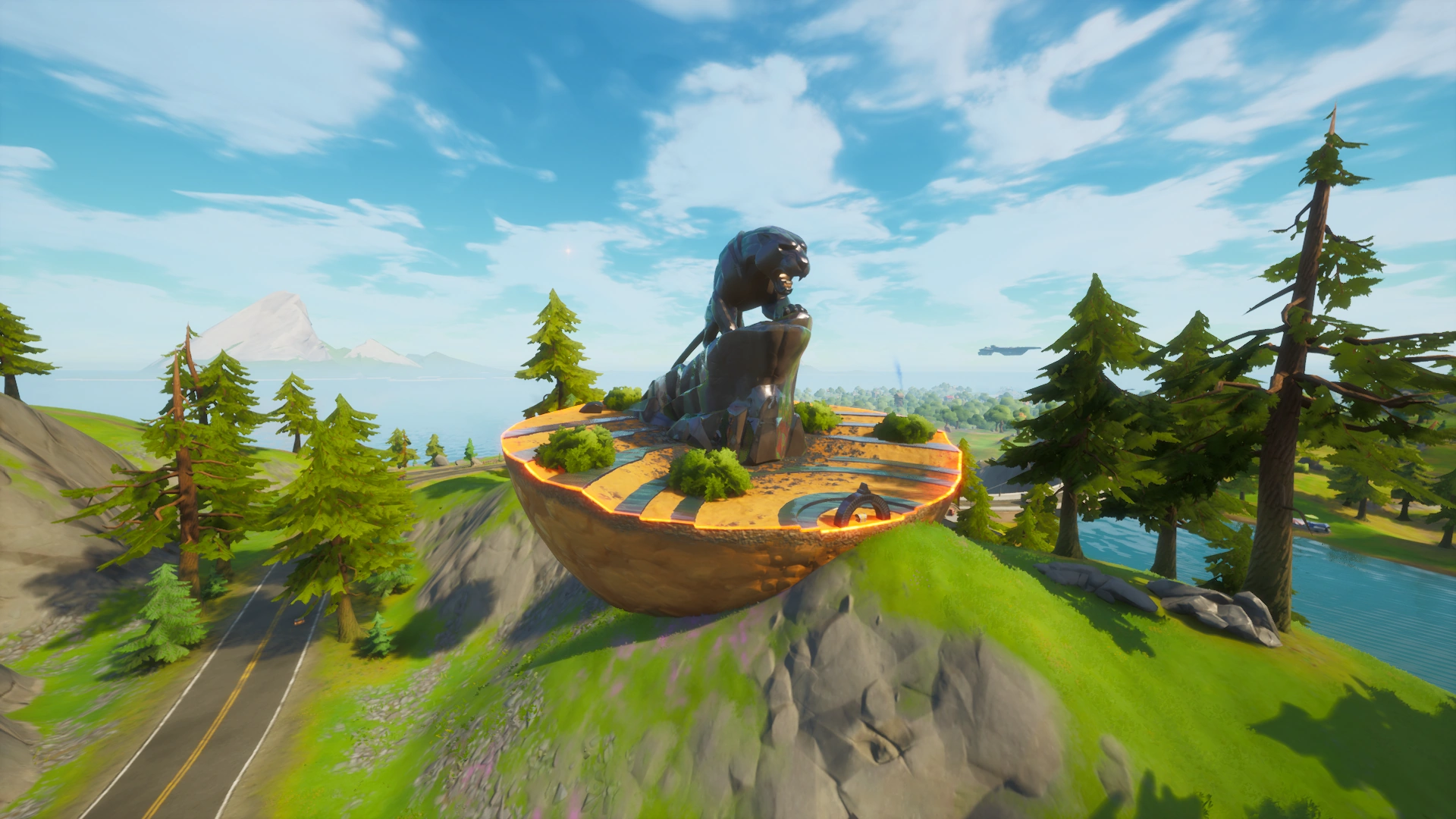 Panther's Prowl was a Landmark in Battle Royale added in Chapter 2 Season 4 located in coordinate E7, west of Misty Meadows and south of Hydro 16. It was a chunk of land that appears to have a Vibranium panther on a Vibranium rock. Both the rock and the panther were indestructible. A couple of rifts were around this area. This landmark was most likely rifted away from the Black Panther universe to the island.