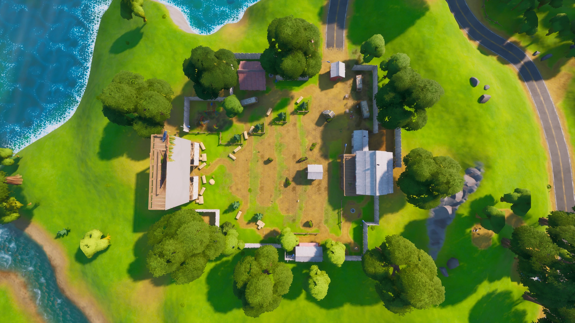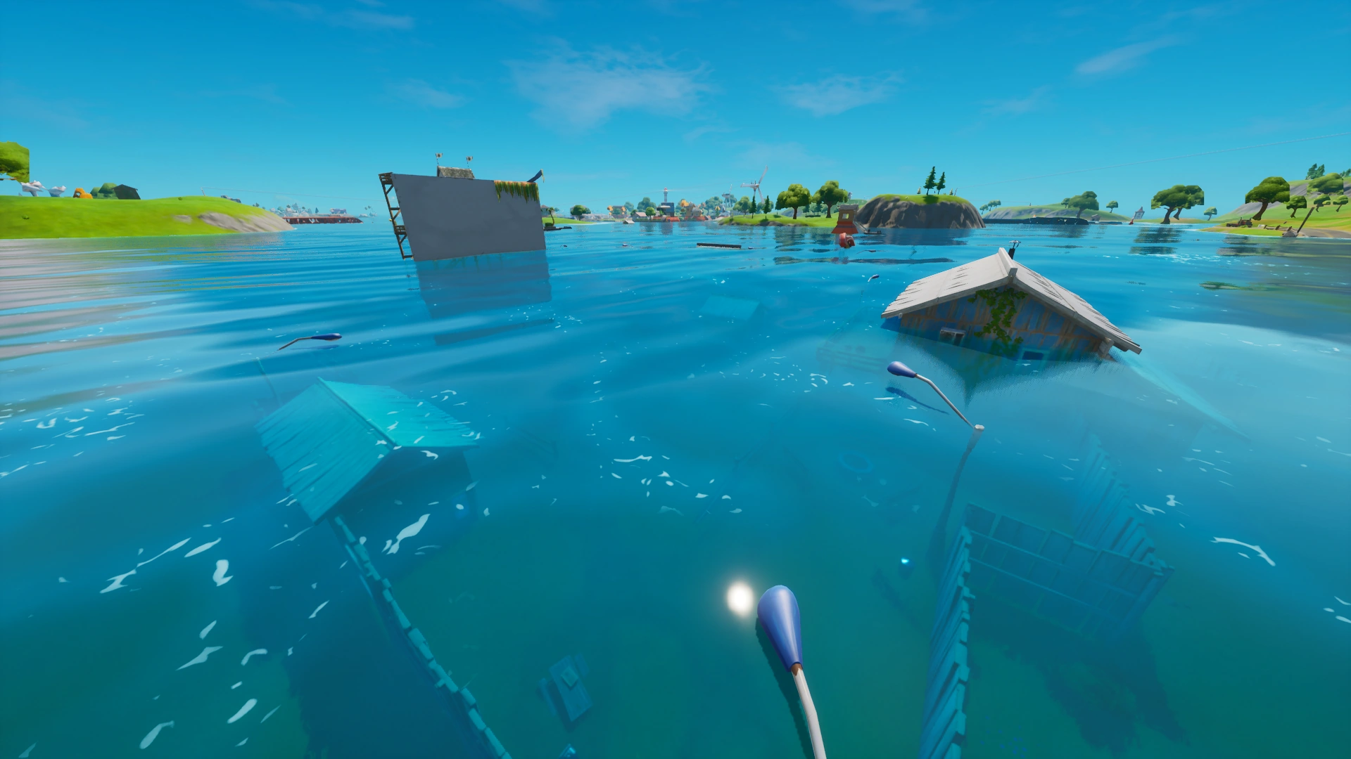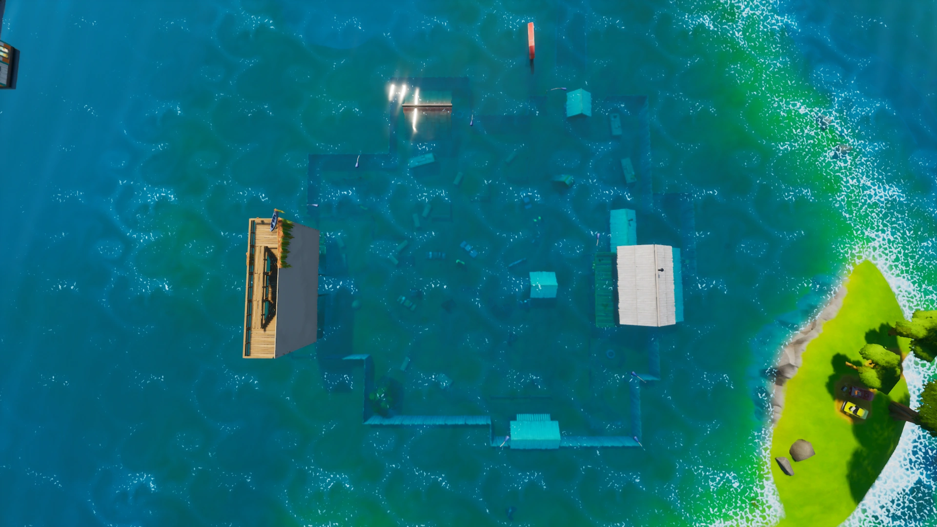 However, on July 11th, 2020 in Patch 13.20, the water in Risky Reels receded, making the area completely dry again. As an aftermath, the vehicles are damaged and covered in seaweed, and some buildings and props were damaged as well, the location remains unnamed.