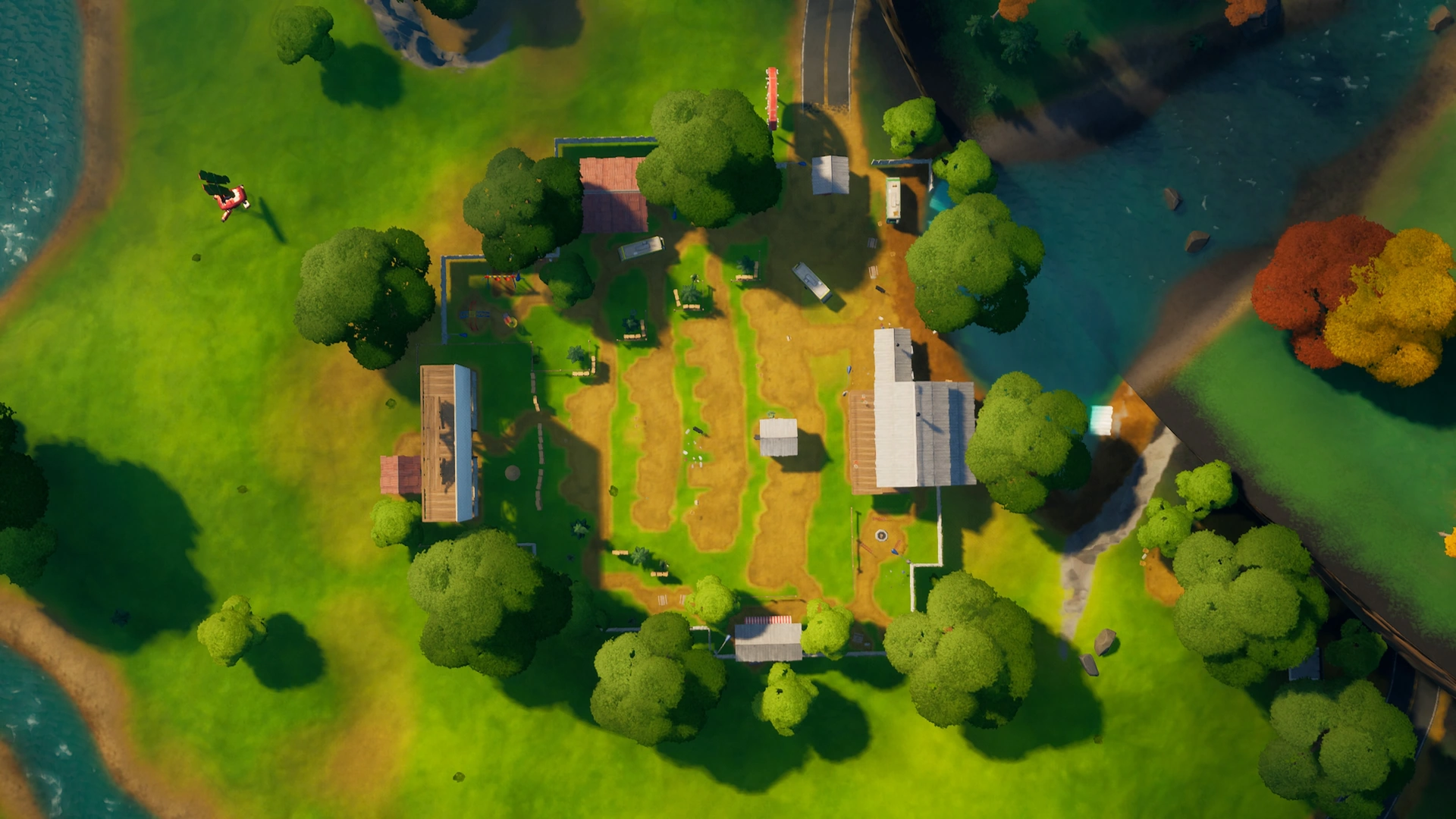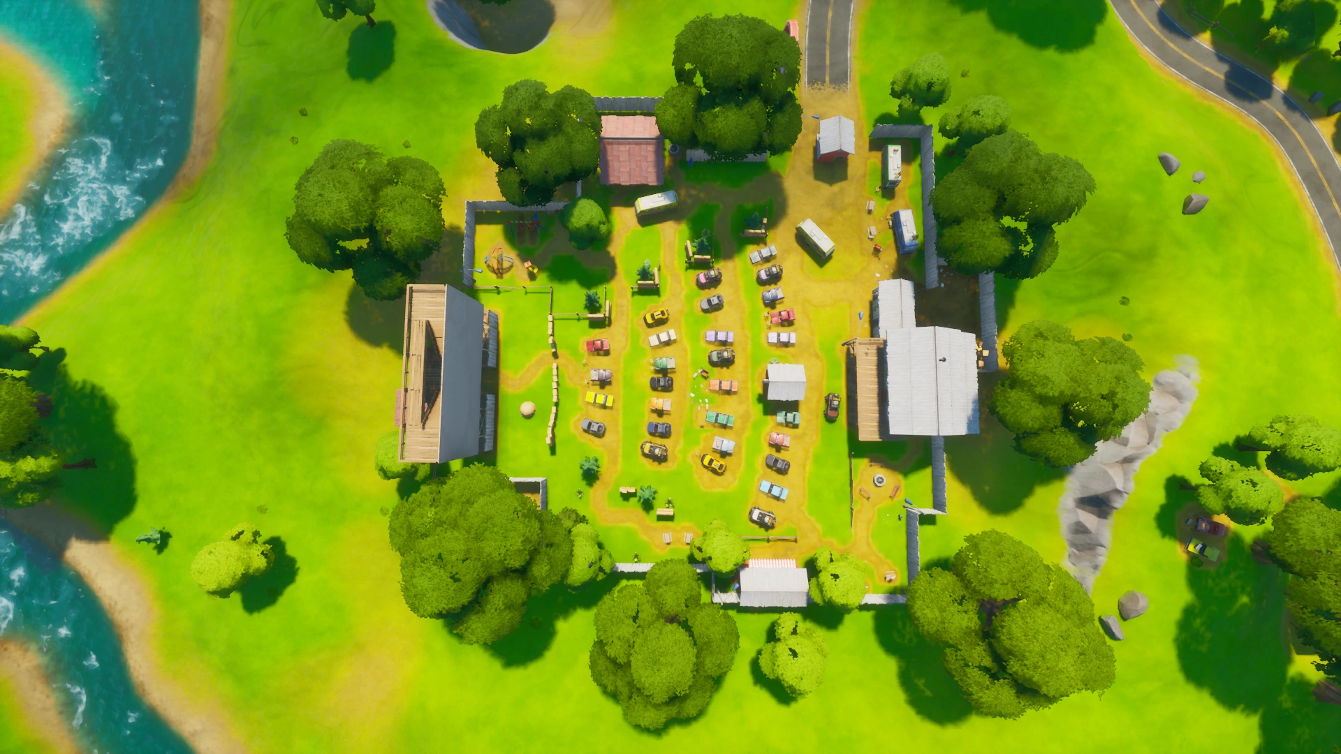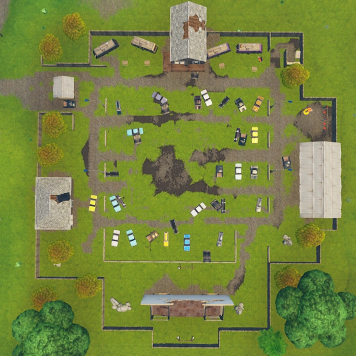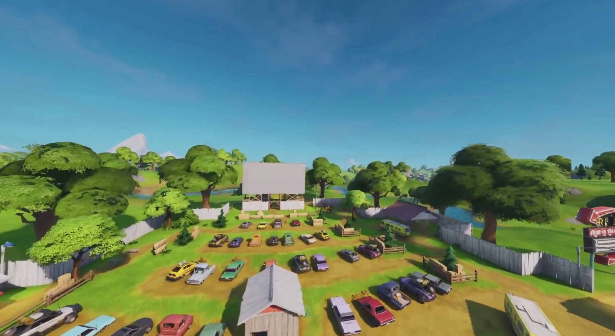 Risky Reels was formerly a named Point Of Interest added in Season 4, located north of Wailing Woods and east of Lazy Links. Throughout its previous lifetime, it played a few videos, the most notable being Prepare for Collision. It also played a small Wreck it Ralph cinematic for a few seconds in Season 6. It was originally released and added on the initial patch of Season 4. In the 5.10 Patch, Risky Reels was updated and repaired. The houses were fixed, fences have been painted and multiple chest spawns have been added on the new cars. The dirt mound from where the crater was was also patched up.