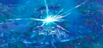 The Blast-Off Event was a Live Event that took place on June 30th 2018, the countdown expired and the rocket took off slowly from the Villain Lair (POI). After a couple of seconds, the thruster flew off and landed at Anarchy Acres. The Rocket sped up and went up, going to the atmosphere. It stopped flying and a messaged was heard across the map saying: "Zero Point Oscillators On, Setting Coordinates..." and some weird noises also appeared. After the message appeared, the lasers turned on and were pointing at Tilted Towers. The rocket boosted really fast, but a big rift appeared over Tilted Towers and swallowed it. Another rift appeared above Moisty Mire and the rocket flew out of it. It was speeding around the map, going over Retail Row, Wailing Woods, then taking a sharp left turn, flying over Loot Lake, then went through Greasy Grove and where the Viking Outpost would eventually be placed before another big rift appearing and taking the rocket. Another big rift appeared over Loot Lake, making some sounds before letting the rocket out and flying up to the sky, before making a big crack in the sky, and then it disappeared.